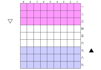 将棋盤は9マス×9マスのマス目でできてます。上図の水色は自陣、ピンク色は敵陣となります。将棋の駒は、自分の駒が敵陣に入ると、成ることができます。成るとは、自分の駒を裏返して、駒自体の動き方が変わるということです。