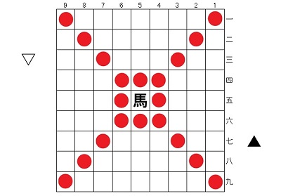 馬は上図の赤丸の場所に移動できます。つまり、角の動きにプラスして、前横後ろに1マスずつ動ける様になります。
