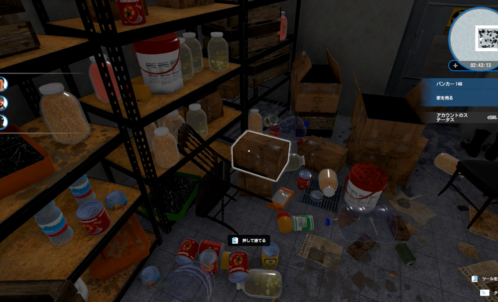 とりあえず家じゅうぐるっと見回りながらゴミを片付け、残っていたボロ家具もとっとと売却。リビング横の個室に、バンカーへの入り口を発見しました。