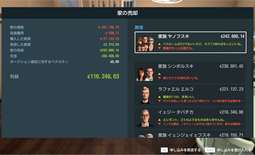 競売の結果はこんな感じ。交渉で見事50000ユーロ以上吹っ掛ける事に成功し、新しい実績が解除されました。ヤッター!