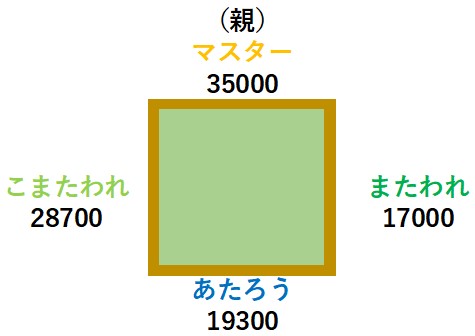 ※「あたろう」が4000点、「またわれ」と「マスター」が2000点を「こまたわれ」に払う。